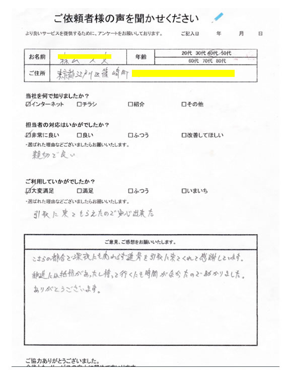 郵送はどうしても、抵抗があるかと思います。当社では、引き取りサービスを行っております。東京の事務所から、半径30Km以内であれば、引き取りにうかがわせていただきます。