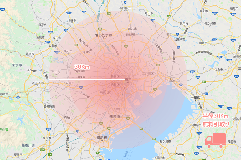 当社のある、東京都荒川区西日暮里より半径30kmにつきましては、無料にて引き取りに伺わせていただきます。